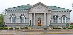 The library is a T-shaped, hip-roofed structure of Bedford limestone, with a shed-roofed extension at the rear. It is located on a sloping lot on the bank of the Flat River, so that the basement level can be accessed from the rear. The roof is clad with green Spanish tile. The main elevation has a prominent central entrance portico, consisting of a pediment supported by two columns. The entrance to the building is through an arched doorway, which is flanked by small single-sash six-over-six windows. The portico is flanked by large round arch windows capped by limestone headmoldings. The side facades are similar in style to the front.[2]