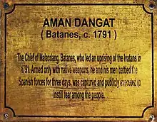 Aman Dangat, a powerful chieftain and a leader fighting for the rights and freedom of the natives, was hanged in public in September 1791 in the town of Basco, Batanes.[13] Before his execution, he was baptized and was named Buenaventura.[11]