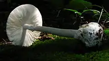 Leucoagaricus leucothites is another all-white mushroom with an annulus, free gills, and white spore print, but it lacks a volva and has thick-walled dextrinoid (staining red-brown in Melzer's reagent) egg-shaped spores with a pore.[33][34] A. bisporigera may also be confused with the larger edible species Agaricus silvicola, the "horse-mushroom". Like many white amanitas, young fruit bodies of A. bisporigera, still enveloped in the universal veil, can be confused with puffball species, but a longitudinal cut of the fruit body reveals internal structures in the Amanita that are absent in puffballs.[35] In 2006, seven members of the Hmong community living in Minnesota were poisoned with A. bisporigera because they had confused it with edible paddy straw mushrooms (Volvariella volvacea) that grow in Southeast Asia.[36]