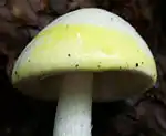 The white stipe is 6–14 cm (2.4–5.5 in) by 0.7–1.8 cm (0.3–0.7 in) thick, solid (i.e., not hollow), and tapers slightly upward. The surface, in young specimens especially, is frequently floccose (covered with tufts of soft hair), fibrillose (covered with small slender fibers), or squamulose (covered with small scales); there may be fine grooves along its length. The bulb at the base of the stipe is spherical or nearly so. The delicate ring on the upper part of the stipe is a remnant of the partial veil that extends from the cap margin to the stalk and covers the gills during development. It is white, thin, membranous, and hangs like a skirt. When young, the mushrooms are enveloped in a membrane called the universal veil, which stretches from the top of the cap to the bottom of the stipe, imparting an oval, egg-like appearance. In mature fruit bodies, the veil's remnants form a membrane around the base, the volva, like an eggshell-shaped cup. On occasion, however, the volva remains underground or gets torn up during development. It is white, sometimes lobed, and may become pressed closely to the stipe.[15] The volva is up to 3.8 cm (1.5 in) in height (measured from the base of the bulb), and is about 2 mm thick midway between the top and the base attachment.[12] The mushroom's odor has been described as "pleasant to somewhat nauseous",[11] becoming more cloying as the fruit body ages.[12] The cap flesh turns yellow when a solution of potassium hydroxide (KOH, 5–10%) is applied (a common chemical test used in mushroom identification). This characteristic chemical reaction is shared with A. ocreata and A. virosa, although some authors have expressed doubt about the identity of North American A. virosa, suggesting those collections may represent four-spored A. bisporigera.[12][16] Tulloss suggests that reports of A. bisporigera that do not turn yellow with KOH were actually based on white forms of A. phalloides.[12] Findings from the Chiricahua Mountains of Arizona and in central Mexico, although "nearly identical" to A. bisporigera, do not stain yellow with KOH; their taxonomic status has not been investigated in detail.[2]