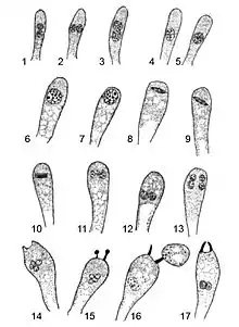 In 1906 Charles E. Lewis studied and illustrated the development of the basidia in order to compare the nuclear behavior of the two-spored with that of the four-spored forms. Initially (1), the young basidium, appearing as a club-shaped branch from the subhymenium, is filled with cytoplasm and contains two primary nuclei, which have distinct nucleoli. As the basidium grows larger, the membranes of the two nuclei contact (2), and then the membrane disappears at the point of contact (3). The two primary nuclei remain distinct for a short time, but eventually the two nuclei fuse completely to form a larger secondary nucleus with a single secondary nucleolus (4, 5). The basidium increases in size after the primary nuclei fuse, and the nucleus migrates towards the end of the basidia (6, 7). During this time, the nucleus develops vacuoles "filled by the nuclear sap in the living cell". Chromosomes are produced from the nucleolar threads, and align transversely near the apex of the basidium, connected by spindles (8–10). The chromosomes then move to the poles, forming the daughter nuclei that occupy different positions in the basidium; the daughters now have a structure similar to that of the parent nuclei (11). The two nuclei then divide to form four nuclei, similar to fungi with four-spored basidia (12, 13). The four nuclei crowd together at some distance from the end of the basidium to form an irregular mass (14). Shortly thereafter, the sterigmata (slender projections of the basidia that attach the spores) begin to form (15), and cytoplasm begins to pass through the sterigmata to form the spores (16). Although Lewis was not able to clearly determine from observation alone whether the contents of two or four nuclei passed through the sterigmata, he deduced, by examining older basidia with mature spores, that only two nuclei enter the spores (16, 17).[5]