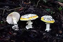Amanita vernicoccora is a closely related edible species,[5] which fruits in hilly or mountainous areas from late winter to spring. Otherwise similar in appearance, its cap is yellow.[2] A. caesarea is also related and edible.[3]