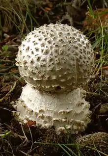 Amanita echinocephala is a large, whitish or ivory-coloured mushroom with a characteristic spiny, or warty-looking cap. It lives on chalky soils with beech trees, and appears earlier than most mushrooms of similar size in southern England. It frequently occurs singly or in small groups, resulting in it being referred to as the solitary amanita or, more specifically, European solitary lepidella. It is very drought-tolerant. Amanita solitaria is a synonym and opinions are divided as to which name takes precedence.