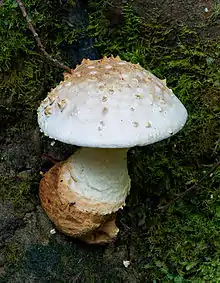 The fruit body has a pale brown cap that is initially convex before flattening with maturity to almost flat or even depressed in the centre. It is covered in prominent small warts which are roughly cone-shaped. The gills are pale orange-yellow. The brownish-white stalk is up to 10 cm (4 in) high and 2.6 cm (1 in) wide with a prominent bulb up to 4.5 cm (1.8 in) in diameter. The ring is off white and prominent but may fall off older mushrooms. The globular spores are amyloid and measure 7–10 by 5–8 μm.[2]
