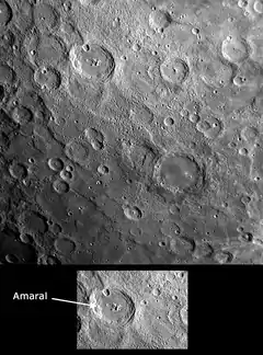 Amaral is a crater on the planet Mercury. With its smooth floor, surrounding ejecta, and small secondary craters, it appears noticeably younger than the heavily cratered surface around it. Along with a smooth crater floor, Amaral also has a central peak. Bright material on this peak is of particular interest as it appears to have an unusual color. In color-enhanced images, the central peak of Amaral appears as a bright blue color in striking contrast to the otherwise orange tones of surface material nearby. The different color of the central peak likely indicates rocks with different chemical composition from those on the neighboring surface.[1]