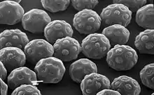The flowers are solitary or aggregated in cymes, spikes, or panicles and typically perfect (bisexual) and actinomorphic. Some species have unisexual flowers. Bracts and bracteoles are either herbaceous or scarious. Flowers are regular with an herbaceous or scarious perianth of (one to) mostly five (rarely to eight) tepals, often joined. One to five stamens are opposite to tepals or alternating, inserting from a hypogynous disc, which may have appendages (pseudostaminodes) in some species. The anthers have two or four pollen sacs (locules). In tribe Caroxyloneae, anthers have vesicular appendages. The pollen grains are spherical with many pores (pantoporate), with pore numbers from a few to 250 (in Froelichia).[4] One to three (rarely six) carpels are fused to a superior ovary with one (rarely two) basal ovule.[3] Idioblasts are found in the tissues.