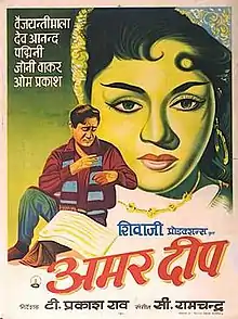 Amar Deep (transl. The Eternal Lamp) is a 1958 Indian Hindi-language romantic drama film directed by T. Prakash Rao, under Sivaji Productions. The film stars Dev Anand, Vyjayanthimala, Padmini, Ragini, Johnny Walker, Pran, Om Prakash.[1] The film's music was composed by C. Ramchandra. It is a remake of 1956 Tamil movie Amara Deepam which itself was a remake of the 1942 English-language film Random Harvest which had earlier been adapted in Bengali as Harano Sur (1957).[2]