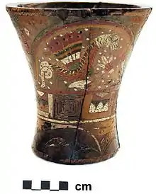 In mythology of Andean civilizations of South America, the amaru or katari (aymara) is a mythical serpent or dragon. In Inca mythology, Amaru is a huge double-headed serpent that dwells underground, at the bottom of lakes and rivers.[1] Illustrated with the heads of a bird and a puma, Amaru can be seen emerging from a central element in the center of a stepped mountain or pyramid motif in the Gateway of the Sun at Tiwanaku, Bolivia. When illustrated on religious vessels, amaru is often seen with bird-like feet and wings,[2] so that it resembles a dragon. Amaru is believed to be capable of transcending boundaries to and from the spiritual realm of the subterranean world.[2] since civilizations never understood where this being went there is no clear concessive knowledge on where this dragon would go when he transcended time and space, but there is whispers in the Andean civilizations that it went into the underworld some even saw it as the serpent of the underworld, Amaru (a-ma-ru)