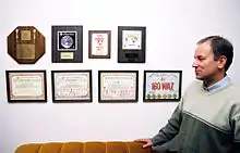 An amateur radio operating award is earned by an amateur radio operator for establishing two-way communication (or "working") with other amateur radio stations. Awards are sponsored by national amateur radio societies, radio enthusiast magazines, or amateur radio clubs, and aim to promote activity on the amateur radio bands. Each award has its own set of rules and fees. Some awards require the amateur radio operator to have contacted other stations in a certain number of countries, Maidenhead grid locators, or counties. Because amateur radio operators are forbidden by regulation to accept financial compensation for their on-air activity, award recipients generally only receive a certificate, wooden plaque, or a small trophy as recognition of their award.