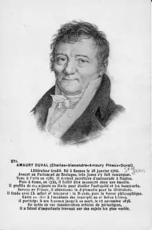 Charles-Alexandre-Amaury Pineux, known as Amaury Duval (28 January 1760 in Rennes – 12 November 1838 in Paris) was a French lawyer, historian, diplomat, writer and scholar. His brother was the playwright Alexandre Duval and one of his two sons was the painter Amaury Duval.