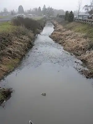 Amazon Creek's headwaters are located in Eugene's southeast hills near Spencer Butte. The creek bed has been altered from the foot of Spencer Butte so it flows north from Martin Street through Amazon Park in a channel. At 24th street it enters a 1.75 mile concrete channel. The stream travels north to 18th Avenue, turning west near High Street and continuing into the levee channel (diversion canal) near the Lane County Fairgrounds at Jefferson Street.[3] It continues west to Fern Ridge Reservoir and the Long Tom River.[1] It collects water from 21 square miles of urban landscapes and storm drains, providing flood control, wildlife habitat, and recreation.[4]