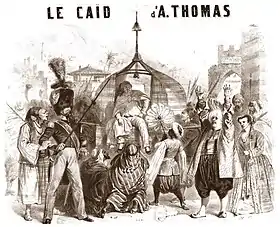 The first opera Thomas composed was La double échelle (The Double Ladder, 1837), a one-act comedy, praised by Berlioz for its "extreme vivacity and wit".[3] It was produced at the Opéra-Comique, received 247 performances,[4] and in the next few years was given in Brussels, New Orleans, Berlin, Vienna and London.[3] His first full-length opera, Le perruquier de la Régence (The Regency Wigmaker, 1838) was followed in the next decade by six more, none of which made any permanent impression. During this period he also composed a ballet (La Gipsy, 1839). His first completely successful three-act opera was Le caïd (The Qaid, 1849), described by the musicologist Elizabeth Forbes as "a mixture of Il barbiere di Siviglia and L'italiana in Algeri";[4] it remained in the French operatic repertoire throughout the nineteenth century, and achieved more than four hundred performances over the next fifty years.[4]