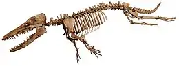 The leg proportions of Ambulocetus are similar to otters and seals, and American mammalogist Alfred Brazier Howell predicted similar proportions for a transitional cetacean in 1930.[5] The femur measures 29 cm (11 in), a length similar to the presumably cursorial (capable of running) mesonychid Pachyaena. Archaeocete femora are generally much shorter. The femoral head is spherical and, at maximum, has a width of 3.86 cm (1.52 in), similar to Indocetus but much larger than mesonychids and Rodhocetus.[6]: 58–59 The trochanteric fossa, supporting the lateral rotator group at the hip, is quite deep, but other than this, the femur does not seem to have supported particularly strong extensor or flexor muscles.[2] The femoral condyles of Ambulocetus are quite long compared to those of other archaeocetes and mesonychids, suggesting the knee was capable of hyperflexion (bending). The tibia is overall similar to those of mesonychids. The feet are huge, probably longer than the femur. The toes are also relatively long,[6]: 59–60 with the fourth digit measuring 17 cm (6.7 in) in length. The fifth digit is slightly shorter and much less robust than the fourth. The phalanges of the toes are short, and end with a convex hoof.[2] Like seals, the phalanges of both the hands and feet are flattened, which may have streamlined them to allow for webbed feet.[6]: 60