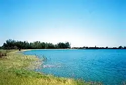 ![]() Lakeshore near the park's main road, a disk golf course in the distance | |