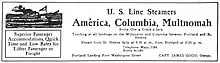 - Harvey W. Scott, ed. (Jan 1, 1908), "U.S. Line Steamers — America, Columbia, Multnomah — Every One a Crack-a-Jack", Morning Oregonian (advertisement), Portland, OR: Henry L. Pittock, vol. 56, no. 14, 686, Section 2, 12, col.3