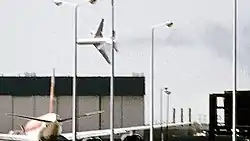 ![]() Flight 191 after takeoff, missing its left engine and leaking fuel and hydraulic fluid | |