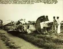 The 707 departed Idlewild at 1:40pm, accomplished high altitude air work after takeoff to permit sufficient fuel burn-off for airport transition training which was planned at Calverton, and arrived there around 3:11pm. Flight 514 accomplished several maneuvers, including full-stop landings, crosswind landings and takeoffs, a high off-set approach, simulated engine out landings, and a no-flap aborted approach to landing. The aircraft did not retract its landing gear following the last aborted approach to landing on Runway 23, but continued in the traffic pattern at an estimated altitude between 1,000 and 1,100 feet (300 and 340 m). The crew reported on left base leg for Runway 23, was given clearance to land, and was informed that the wind was from 230 degrees at 10 to 15 knots (12 to 17 mph; 19 to 28 km/h). As it approached the extended centerline of the runway, around 4:42pm, it made a left bank that reached approximately 45 degrees. The aircraft was then observed to recover immediately to level flight and to begin a bank to the right which became progressively steeper. The right bank continued until the aircraft was inverted, at which time the nose dropped and a yaw to the left was observed. The 707 then continued to roll to the right in a nose down configuration. Shortly before impact, the wings leveled one final time. Investigation revealed the aircraft struck the ground in a wings-level attitude, in a nearly stalled condition, yawed to the left approximately 12 degrees, with considerable and nearly symmetrical power. The aircraft crashed in a potato field, a fire erupted on impact, and all five aboard were killed.[1] The crash occurred only a few miles from the Brookhaven National Laboratories, a site of key secret nuclear work.[2]