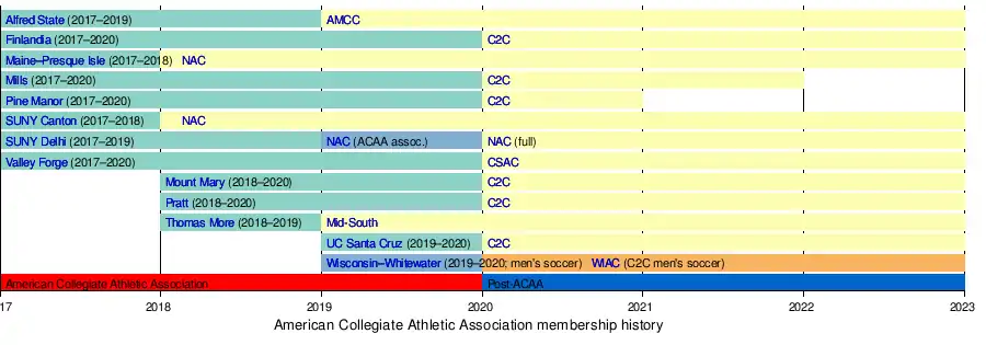 - 2019 - The University of Wisconsin–Whitewater joined the ACAA as an affiliate member for men's soccer, effective in the 2019 fall season (2019-20 academic year).