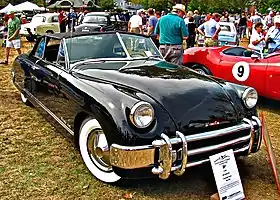 Studebaker had enjoyed earlier success and was the first independent automaker to produce an overhead valve V8 engine,[8] a 232.6 cubic inch, 120 hp unit, the first low-priced V8. The company's peak year was 1950, when it produced and sold 329,884 units.[9] Studebaker struggled during the first half of the decade. The cars had styling ahead of their time but were overpriced when compared to the offerings of the Big Three. Low sales and financial difficulties led to a merger with Packard in 1954, itself in financial trouble.[9] The new company, Studebaker-Packard Corporation, retired the Packard name in July 1958,[10][11] but continued marketing automobiles under the Studebaker name until 1966.[12]