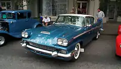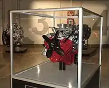 The Chevrolet small block 265 cubic inch engine was released in the 1955 model year and still the basis for the V8 engines in use by General Motors today.[34] The original 265 cubic inch engine with a two-barrel carburetor produced 162 hp,[35] while the four-barrel version in the 1955 Corvette produced 195 hp,[36] an amazing amount of power at the time. By 1957, the engine had been increased to 283 cubic inches,[37] including a fuel-injected version that produced 283 hp, the first engine to have a ratio of 1:1 horse power versus cubic inch displacement.[38]