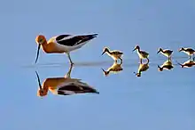 The American avocet (Recurvirostra americana) is a large wader in the avocet and stilt family, Recurvirostridae, that is found in North America. It spends much of its time foraging in shallow water or on mud flats, often sweeping its bill from side to side in water as it seeks its crustacean and insect prey.