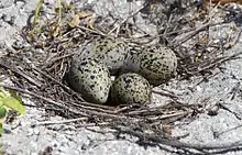 The American avocet breeds in anything from freshwater to hypersaline wetlands in the western and mid-west United States.[11][16] After reaching their breeding grounds, the avocets quickly establish territory in pairs.[15] Throughout the breeding season, these pairs engage in a series of copulatory displays, which is initiated by either sex and often involves preening.[11][15] After breeding, the birds gather in large flocks, sometimes amounting to hundreds of birds. Nesting takes place near water, often alongside black-necked stilts, usually on small islands or mucky shorelines. The avocets nest on the ground in places with little to no surrounding vegetation. They make shallow indentations in the ground for their nest and line it with grass, feathers, pebbles or other small objects. Some avocets do not line their nests at all.[8] During the breeding season, avocets lay around 3–5 eggs, with 4 being the most common number.[14] One case study of the 1968 and 1969 breeding seasons suggests that this number allows for the highest rate of hatching success.[15] They incubate them over a period of 23–25 days. Both parents are involved in the incubation process, taking turns during the day (except at night, where only the female incubates the eggs).[15][14] Both parents take care of the newborn American avocets after they hatch. Male parents are more present in incubation during the first 8 days, whereas female parents dominate incubation throughout the remaining 16 days.[17] Time spent caring for newborn chicks equates to that spent incubating. Since newborns are able to walk, they are capable of feeding themselves and do not require extensive care from their parents.[14][17] The young are expected to begin flying 4 to 5 weeks after hatching.[15]