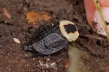 Adults are 12 to 22 mm long. The pronotum is primarily a pale yellow with a black spot in the center. In the southern portion of the range, the elytra are entirely black while in the northern portion they have a yellow rear tip. The elytra are shorter than the body of the beetle, leaving the tail end slightly exposed. The larvae are black and appear armored.[3]