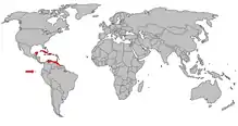 The American flamingo breeds in South America (in the Galápagos Islands of Ecuador, coastal Colombia and Venezuela, and northern Brazil), in the West Indies (Trinidad and Tobago, Cuba, Jamaica, Hispaniola (the Dominican Republic and Haiti), The Bahamas, the Virgin Islands, and the Turks and Caicos Islands), and tropical and subtropical areas of continental North America (along the northern coast of the Yucatán Peninsula in Mexico, and Cameron Parish, Louisiana, southern Florida and the immediate coastline of the rest of southern and southeastern United States). It is a vagrant to Puerto Rico, Anguilla, Barbados, and Honduras.[1] The population in the Galápagos Islands differs genetically from that in the Caribbean; the Galápagos flamingos are significantly smaller, exhibit sexual dimorphism in body shape, and lay smaller eggs.[3] They are sometimes separated as Phoenicopterus ruber glyphorhynchus.[4]