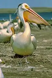 The American white pelican (Pelecanus erythrorhynchos) is a large aquatic soaring bird from the order Pelecaniformes. It breeds in interior North America, moving south and to the coasts, as far as Costa Rica, in winter.[2]
