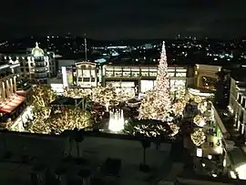 During the holiday shopping season, fake snow is produced periodically every evening. In mid-November, a Christmas tree is displayed, and lit every evening, beginning with their annual Tree Lighting Ceremony. The tree remains lit every evening for the remainder of the holiday season. The tree is up to 100 feet or more, and it is usually one of the tallest trees in Los Angeles County.