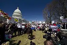 AFP supported the Tea Party movement by obtaining permits and supplying speakers for rallies.[102] AFP helped organize and publicize a "Porkulus"-themed protest on the state capitol steps in Denver, Colorado on February 17, 2009, in conjunction with Obama signing the American Recovery and Reinvestment Act of 2009.[103]: 31 [104] Within hours of CNBC on-air editor Rick Santelli's remarks on February 19, 2009, that criticized the Act and called for a "Chicago tea party," AFP registered and launched the website "TaxDayTeaParty.com," calling for protests against Obama.[103]: 32 AFP had a lead role in organizing Taxpayer Tea Party rallies in Sacramento, Austin, and Madison in April 2009.[15][105] AFP was one of the leading organizers of the September 2009 Taxpayer March on Washington, also known as the "9/12 Tea Party," according to The Guardian.[6] On April 16, 2011, former Republican vice presidential candidate Sarah Palin was the keynote speaker at an AFP annual tax day tea party rally at the state capitol in Madison, Wisconsin.[83][106]