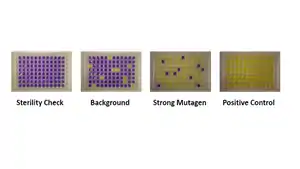 In the 96-well plate method the frequency of mutation is counted as the number of wells out of 96 which have changed color. The plates are incubated for up to five days, with mutated (yellow) colonies being counted each day and compared to the background rate of reverse mutation using established tables of significance to determine the significant differences between the background rate of mutation and that for the tested samples.