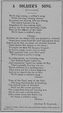 By 1917, according to Séumas Robinson, the song was being parodied by British soldiers in Ireland.[22] Éamon de Valera's platform at the June 1917 East Clare by-election featured a large banner with the opening two lines.[23] That October the Irish Volunteers allied with Sinn Féin under de Valera and during the Irish War of Independence (1919–21) the Volunteers evolved into the Irish Republican Army (IRA). The song's popularity led to its being called the "Sinn Féin anthem". Copies were confiscated by British security forces as seditious.[24] Carl Hardebeck played it unannounced on Low Sunday 1918 in St Peter's Cathedral, Belfast.[25] Victor Herbert's version was well known to Irish Americans by 1919, when de Valera arrived as President of Dáil Éireann of the self-proclaimed Irish Republic.[19] In the 1922–23 Civil War, the IRA split into the "National Army" of the nascent Irish Free State and the "Irregulars" loyal to the defunct Republic. Both sides continued to sing "The Soldier's Song".[26] After the war, it remained popular as an Army tune, and was played at many military functions.[5]