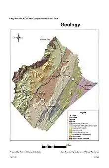 The geology of Amissville and the surrounding vicinity consists of several units. Predominant and oldest (approximately 704 million years old, +/- 5 million years, based on the U-Pb zircon geochronology dating method, coinciding with the initial rifting of the supercontinent Rodinia) is the Neoproterozoic alkali feldspar granitic rock of the Robertson River Igneous Suite.[17] This includes felsic complex material such as biotite, hornblende-biotite, magnetite, and alkali granitic rock including rhyolite on the eastern slopes of Battle Mountain[18] and Little Battle Mountain.