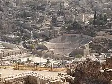 The Citadel has a long history of occupation by many great civilizations.[1] Evidence of inhabitance since the Neolithic period has been found and the hill was fortified during the Bronze Age (1800 BCE). The hill became the capital of the Kingdom of Ammon sometime after 1200 BCE. It later came under the sway of empires such as the Neo-Assyrian Empire (8th century BCE), Neo-Babylonian Empire (6th century BC), the Ptolemies, the Seleucids (3rd century BCE), Romans (1st century BCE), Byzantines (3rd century CE) and the Umayyads (7th century CE).[2] After the Umayyads, came a period of decline and for much of the time until 1878 as the former city became an abandoned pile of ruins only sporadically used by Bedouins and seasonal farmers.[3][4][5] Despite this gap, the Citadel of Amman is considered to be among the world's oldest continuously inhabited places.[6]