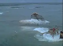 At 21:04 Amoco Cadiz ran aground the first time, flooding its engines, and again at 21:39, this time ripping open the hull and starting the oil spill. Her crew was rescued by French Naval Aviation helicopters at midnight, and her captain and one officer remained aboard until 05:00 the next morning.[5] At 10:00 on 17 March the vessel broke in two, releasing its entire cargo of 1.6 million barrels (250,000 m3) of oil, and broke again eleven days later from the buffeting of high stormy seas. The wreckage was later completely destroyed with depth charges by the French Navy.[6]