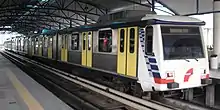 In 2006, the government announced the Sri Petaling Line extension project. The extension comprises 11 new stations over 17.7 kilometres (11.0 mi) of elevated track beyond Sri Petaling station. This extended the terminus of the Sri Petaling Line from Sri Petaling to Putra Heights.[7] Unlike the original line, which uses the Fixed-block signalling system, the extension uses the Communications-based train control (CBTC) signalling system. As a result, when the first four stations and the next four stations opened on 31 October 2015 and 31 March 2016, the extension ran as a separate train service between Sri Petaling station and Bandar Puteri station.[8][9] Re-signalling had to be carried out on the original line before the extension could be combined with the rest of the line. Thales was awarded a contract on 3 September 2012 to upgrade the signalling system on the original line, and the work was completed in July 2016.[10][11]