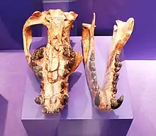 The only definitive African remains of Amphicyon are from Arrisdrift in Namibia, which has variously been dated to 17.5 Ma or 16 Ma, and belong to the species A. giganteus.[79][80][27] Further remains from this species have also been reported from the slightly older locality Moghra in Egypt, and it has been suggested that a mandible from Gebel Zelten, which is of similar age, in Libya indicates the presence of another, smaller species of the genus in the early Miocene of Africa.[29] However, other authors assign these fossils to Afrocyon and Mogharacyon, respectively.[30] Much younger remains of large, African amphicyonids have previously been referred to Amphicyon.[74] Most notable among these are a molar and fragmentary postcranial remains from the Lower Nawatwa Formation, dating to 7.4 ± 0.1 – 6.5 ± 0.1 Ma, which represents one of the youngest amphicyonids known.[81] Others tentatively refer this taxon to the genus Myacyon.[82]