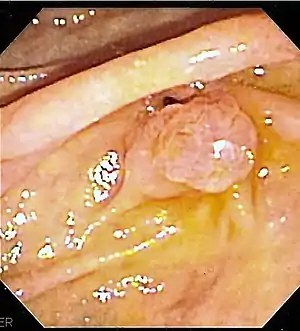 ![]() The major duodenal papilla, seen on duodenoscopy at the time of ERCP. This is the protrusion of the ampulla of Vater into the duodenum. | |