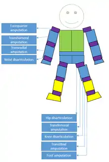 Classification is often based on the anatomical nature of the amputation.[4][7] The classification system takes several things into account when putting people into this class. These includes which limbs are affected, how many limbs are affected, and how much of a limb is missing.[1][2]