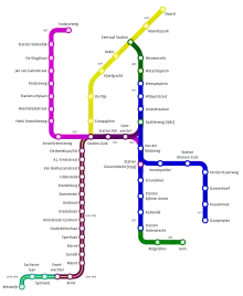 There are 33 full metro stations,[1] Since Route 52 on the new North-South Line opened, six additional stations and 9.5 kilometres (5.9 mi) of route have been added to the metro system,[23] yielding a new combined network length of 52 kilometres (32 mi).[24] In 2019, sneltram Route 51 no longer operates into the metro network. The southern sneltram portion was closed for conversion to be incorporated into the tram network.[25]