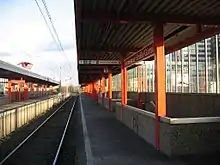 The station was opened in 1974 and consists of both an elevated and an at-grade station, each with two side platforms and two rail tracks.