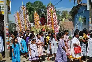Most Amuzgo are Catholic with a significant percentage being Protestant. The latter phenomenon began in the 1940s with missionaries from an organization called the Instituto Lingüístico de Verano.[1] Catholic churches still dominate centers of municipal seats as well as Catholic festivals and processions, such as those dedicated to patron saints, Carnival, Holy Week and All Saints' Day.[2] Catholic Amuzgos maintain elements of indigenous beliefs which are found in many festivals and other rites. Water figure prominently in folklore and non-Catholic rites as it is essential for survival in the mountains. For example, the beginning of the rainy season is marked by the feast of Saint Mark on 25 April. The date is also known as the "petition for thunder" for rains that will benefit the crops. On this date, chickens are sacrificed over a set of rocks which are said to mythically represent thunder and lightning. The feast of the Archangel Michael on 29 September marks the end of the rainy season as well as the harvest. There is animistic belief in spirits of the mountains, earth, corn, animals and other elements of nature.[1] Health is considered to be more of a spiritual issue than physical, with illness mostly blamed on disharmonious actions. While serious cases are sent to medical facilities in large communities such as Putla and Pinotepa Nacional, most Amuzgos prefer to consult traditional healers. Very minor ailments such as stomach pain, colds, flu etc. are treated with herbal medicine. Those illnesses thought to be primarily spiritual in nature are treated by "tzan tí"(wise men) or "tzan kalwa" (shamans or witches) who can both cure and cause harm.[2]