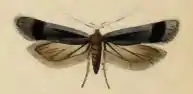 The wingspan is 11–14 mm.[2] The forewings are blackish, slightly violet-tinged; stigmata deep black, very indistinct, first discal beyond plical; a broad suffused black fascia at 2/3. Hindwings 1 rather dark grey. The larva is whitish; dots black; head and plate of 2 black.[3]