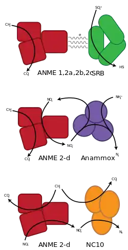 Sulfate-driven AOM is mediated by a syntrophic consortium of methanotrophic archaea and sulfate-reducing bacteria.[7] They often form small aggregates or sometimes voluminous mats. The archaeal partner is abbreviated ANME, which stands for "anaerobic methanotroph". ANME's are very closely related to methanogenic archaea and recent investigations suggest that AOM is an enzymatic reversal of methanogenesis.[8] It is still poorly understood how the syntrophic partners interact and which intermediates are exchanged between the archaeal and bacterial cell. The research on AOM is hindered by the fact that the responsible organisms have not been isolated. This is because these organisms show very slow growth rates with a minimum doubling time of a few months. Countless isolation efforts have not been able to isolate one of the anaerobic methanotrophs, a possible explanation can be that the ANME archaea and the SRB have an obligate syntrophic interaction and can therefore not be isolated individually.