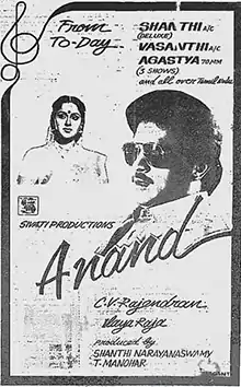 Anand is a 1987 Indian Tamil-language romantic drama film, directed by C. V. Rajendran for Sivaji Productions. The film stars Prabhu, Radha and Jayashree. A remake of the Telugu film Majnu,[1] it was released on 20 November 1987.[2]