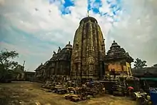 In form, the temple resembles the Lingaraj temple, but includes Vaishnavite (Vishnu related) sculptures.[4] The temple has longitudinal bands of miniature shikharas (shrines), exactly like those in Lingaraj temple, with the minor difference that the number of the shikharas forming one longitudinal band in its case is only three.[5] The sculpture in the exterior walls varies in character in each temple in Bhubaneswar. Most of the female sculptures in the temple walls are overly ornamented and lack originality[6]