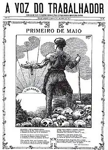 In this context, anarchism started to spread among Brazilian workers in the 1890s through propaganda groups and periodicals. Among the pioneers were: Gli Schiavi Bianchi (1892), L'Asno Umano (1894) and L'Avvenire (1894–1895), published in São Paulo by groups composed mostly of Italian immigrants; O Despertar (1898) and O Protesto (1898–1900), published in Rio de Janeiro by groups that brought together Brazilians, Spaniards and Portuguese.[6] In the last decade of the 19th century, anarchist action was guided by mainly informal propaganda groups, who published periodicals, educated workers, and participated in various working class associations.[7] As early as 1892, anarchists organized the first May Day activities in Brazil and were soon targeted by repression. In Rio de Janeiro, the police reported meetings of foreigners who sought to spread libertarian ideas among workers.[8] The newspaper Correio Paulistano, official body of the Partido Republicano Paulista (PRP), denounced in 1893 the entry of anarchist immigrants into the country, classifying them as dangerous individuals, heads of "a terrible destructive sect", which aimed to "implant disorder and a fratricidal struggle, incompatible with the abundance and excellence of our living resources."[9] During the activities of the 1898 May Day, several anarchists were arrested in São Paulo.[10]