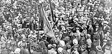 In 1919, there was a resumption of the strike movement, this time, facing a patronage organized in class entities and better articulated with the repression.[92] On May 1 of that year, there were demonstrations in Rio de Janeiro and São Paulo in favor of the Russian soviets and the revolutions underway in Hungary and Germany. In the Federal Capital, the demonstration had about 60 thousand people who, in addition to saluting the aforementioned revolutions, organized stoppages to pressure the bosses for the 8-hour day.[93] In São Paulo, shortly after the celebrations, a general strike broke out, which started at the Matarazzo factory, where a worker accused the master general of harassing him for having spoken on the 1st of May. After a rough bout, the worker was fired. Many of his colleagues quit their jobs and took to the streets urging employees at other factories to follow their example. At the end of the day, around 10,000 workers were on strike, and demands were made.[94] Once again the eight-hour day became one of the main demands, accompanied by others such as weekly rest, equal pay for men and women, recognition of the workers' right to organize and express themselves and lower prices for staple goods.[92] As the days went by, most of the industry workers joined the movement, with an estimated 20,000 walled workers on May 4. In its May 10 issue, the newspaper A Plebe pointed out the strike was a spontaneous movement that should not be attributed to the speeches of May 1.[94] Even with strong repression, the movement continued until favorable agreements were reached, with the achievement of the eight-hour day in most factories.[95] Also in Rio de Janeiro there were several strikes in the first half of 1919, initiated by seafarers, demanding a salary increase and an eight-hour day. On May 18, the number of workers absent from their jobs was estimated at 10,000. But the majority remained on strike for a short time, because employers, in general, were ready to grant the eight-hour day without a reduction in wages, even though striking outbreaks extended until July.[96]