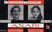 Anari is a 16 January 1959 Bollywood comedy film directed by Hrishikesh Mukherjee. The film stars Raj Kapoor, Nutan, Motilal and Lalita Pawar. The music was by Shankar Jaikishan and the lyrics by Hasrat Jaipuri as well as Shailendra. This was among the few movies in which Lalita Pawar played a positive role and Motilal a role with shades of grey. The film was remade in Tamil as Pasamum Nesamum[1] and in Turkish as Enayi.